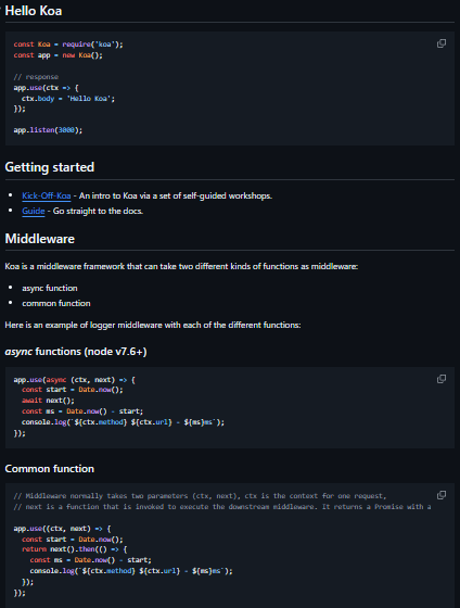 Koa is a minimal, expressive web framework for Node.js created by the team behind Express, built around modern JavaScript features. Its middleware system uses async functions and an “onion” execution model, producing clean, sequential control flow for request/response handling. Koa keeps the core small and unopinionated—there’s no built-in router or templating—so developers compose only the pieces they need. The framework exposes a refined Context object to standardize request and response utilities without obscuring Node’s primitives. This design encourages readable middleware, robust error handling, and straightforward composition for tasks like authentication, logging, and body parsing. In production, Koa’s simplicity and async-first approach translate to predictable performance and maintainable server code.